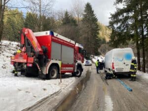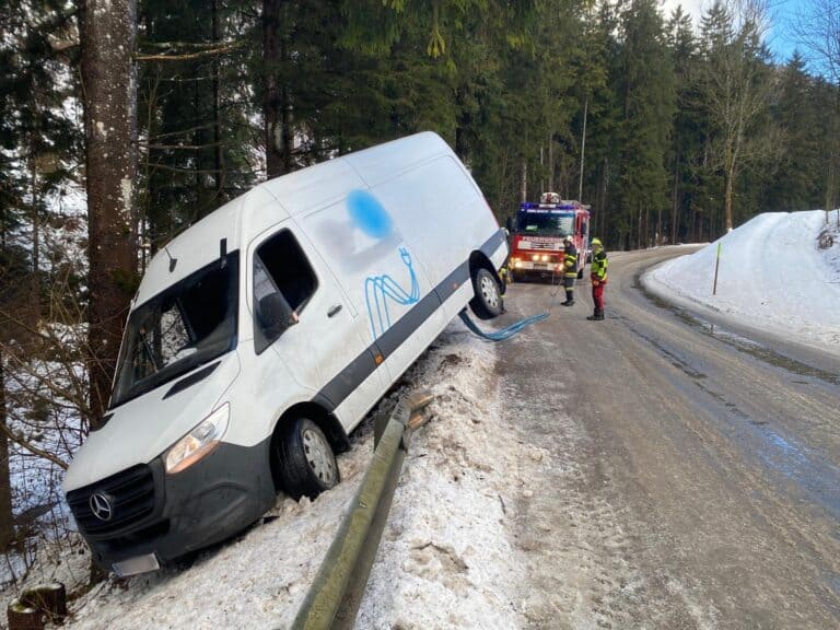 Aus bisher ungeklärter Ursache kam ein Kleintransporter von der Fahrbahn ab und drohte weiter abzurutschen.