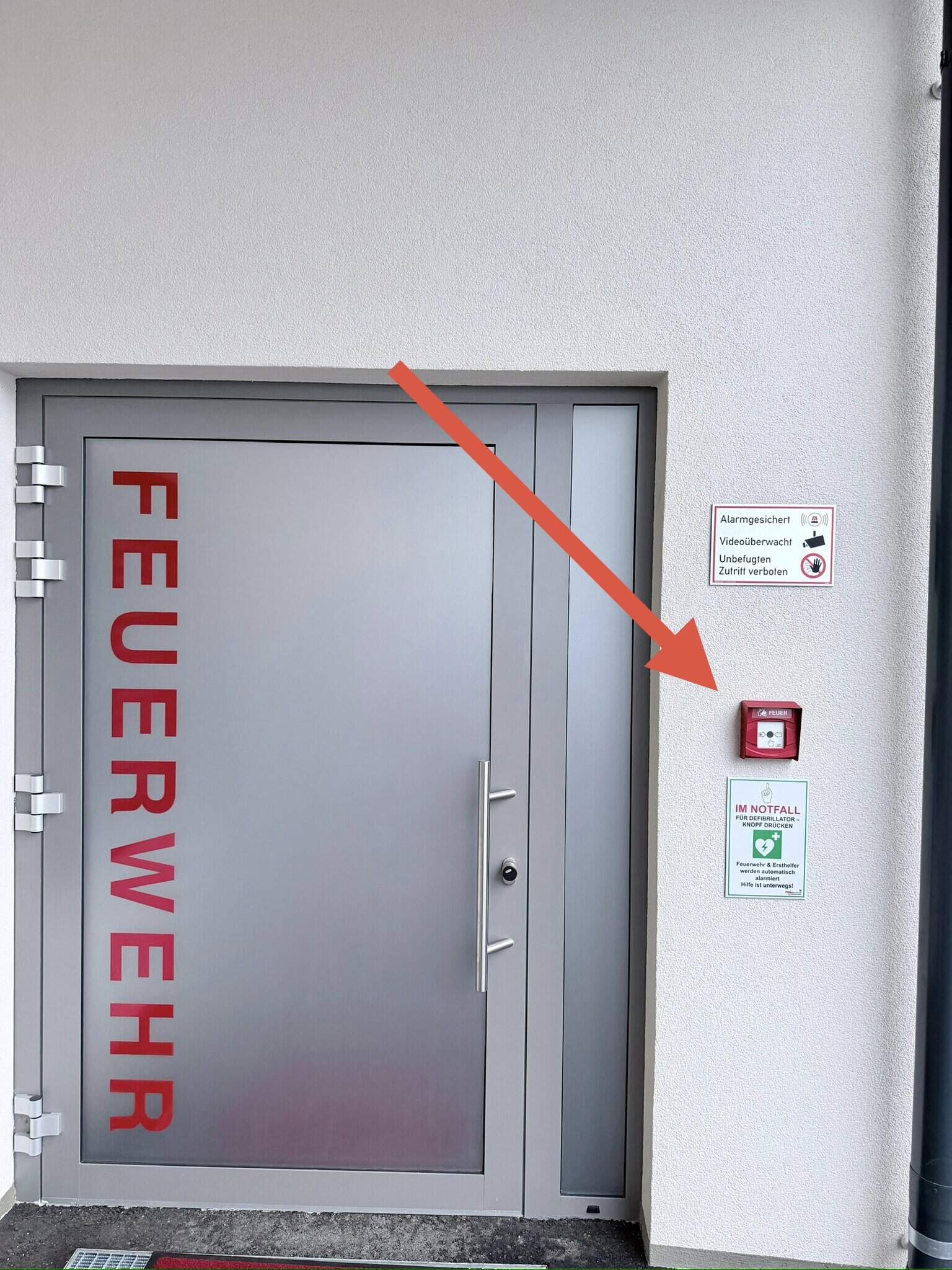Zwischen den Feuerwehr-Garagentoren und dem Eingang befindet sich ein Druckknopfmelder.