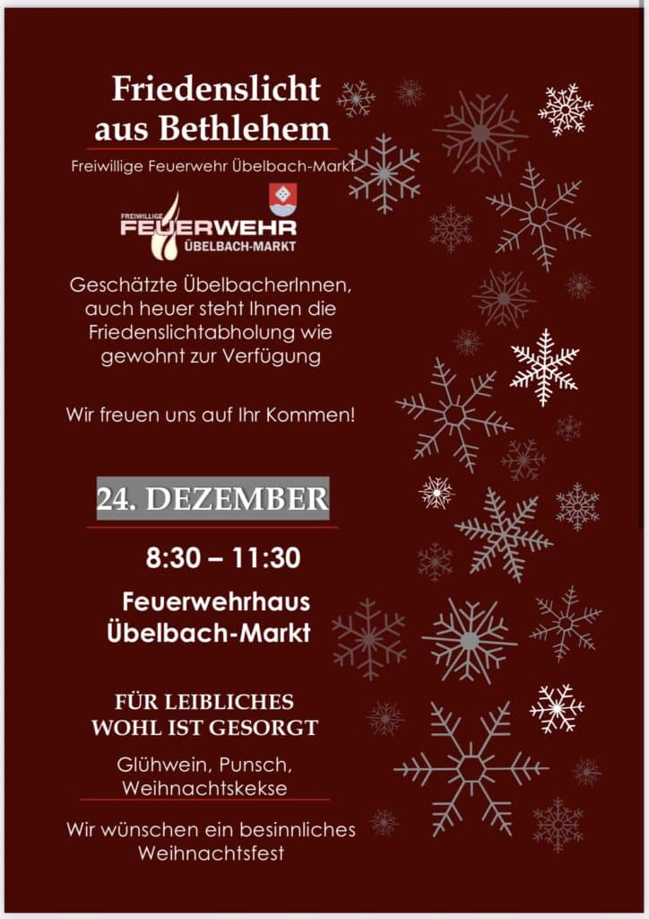 Auch heuer findet wieder die traditionelle Friedenslichtverteilung am 24.12. von 8:30 Uhr bis 11:30 Uhr beim Feuerwehrhaus statt.